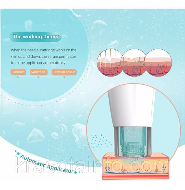 Принцип роботи цього апарату Гідра Піна такий самий, як і в професійного дермаштампу або дермапена, це автоматичні поступальні рухи вгору-вниз, мікропроколи шкіри. Головне відмінність от дерамаштампа - це насадки, які спочатку заповнюються концентратом, коктейлем, сироваткою і в процесі роботи вже проникають у шкіру автоматично.